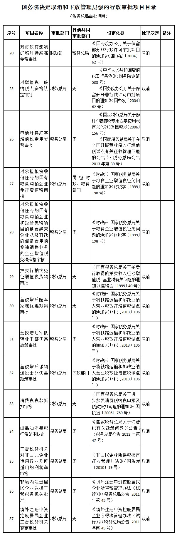 | 国务院日前决定取消和调整一批行政审批项目。在取消和下放管理层级的94项行政审批项目中,涉及税务总局审批的有14项,包括取消对增值税一般纳税人资格认定审批、申请开具红字增值税专用发票审核、消费税税款抵扣审核等。